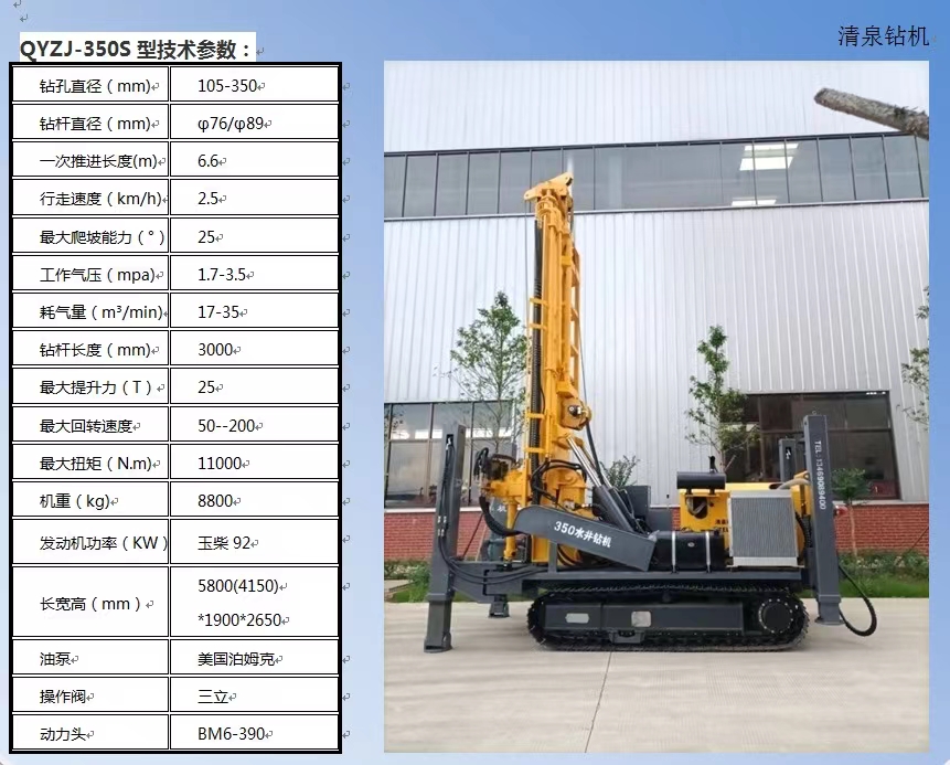 清泉350S型潛孔水井鉆機 發(fā)動機功率:玉柴92千瓦。 油泵:美國泊姆克~ 動力頭馬達(dá): BM6-390。 最大扭矩: 11000扭米。 最大提升力: 25噸。 操作閥:三立。 整機機重: 8.8噸。 尺寸:長5.8米(底長4.15米),寬1.9米,高2. 65米 鉆孔直徑: 105-350 毫米。 鉆桿直徑: φ 76/φ89毫米(3米)